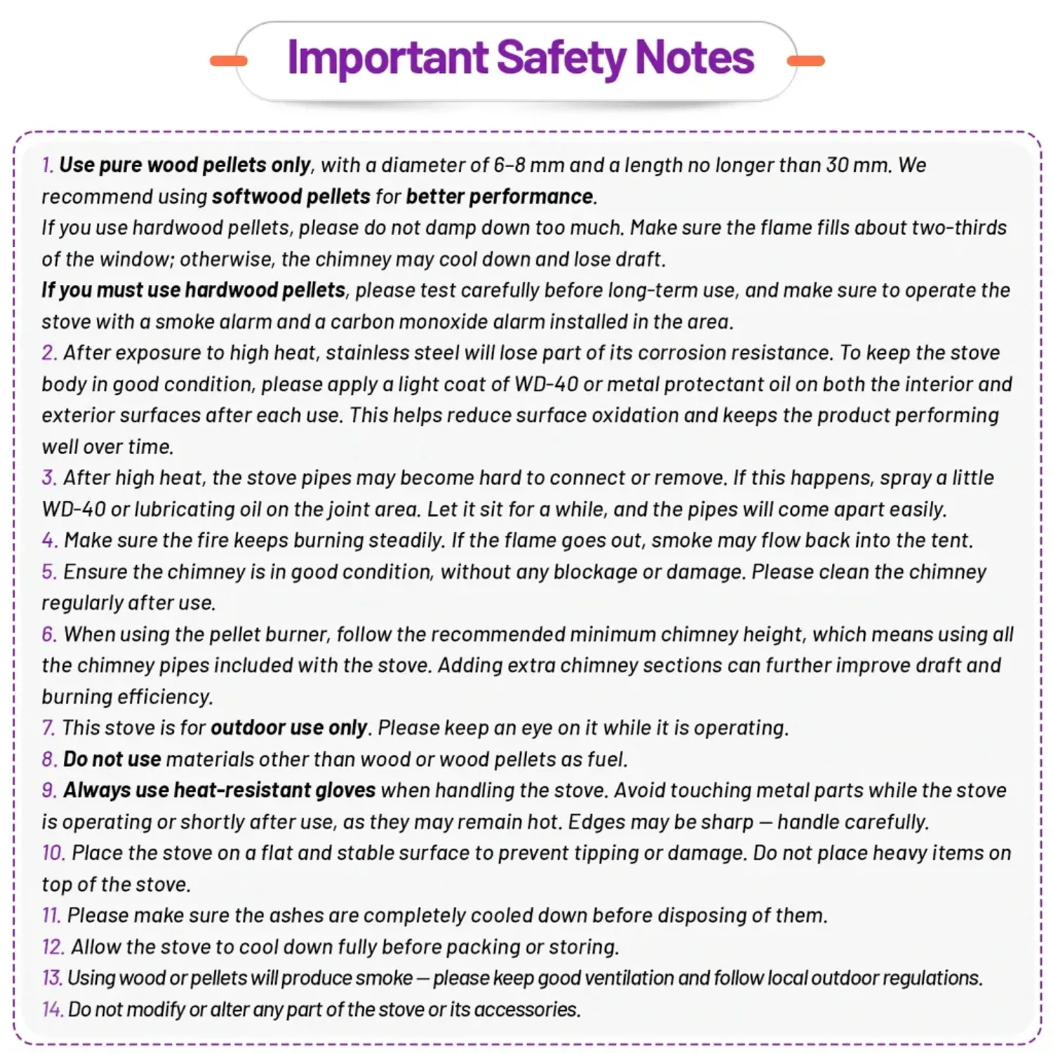 ⏳ 2. 10 цагийн тасралтгүй шаталт (10-Hour Constant Burn) Пеллет (шахмал) түлшний савыг нэг дүүргэхэд 10 цагийн турш автоматаар бага багаар түлшээ нэмж, тогтмол хэмд тасралтгүй ажиллана. Шөнө дунд босож гал манах шаардлагагүй, өглөө сэрэхэд майхан тань дулаахан хэвээр угтана.