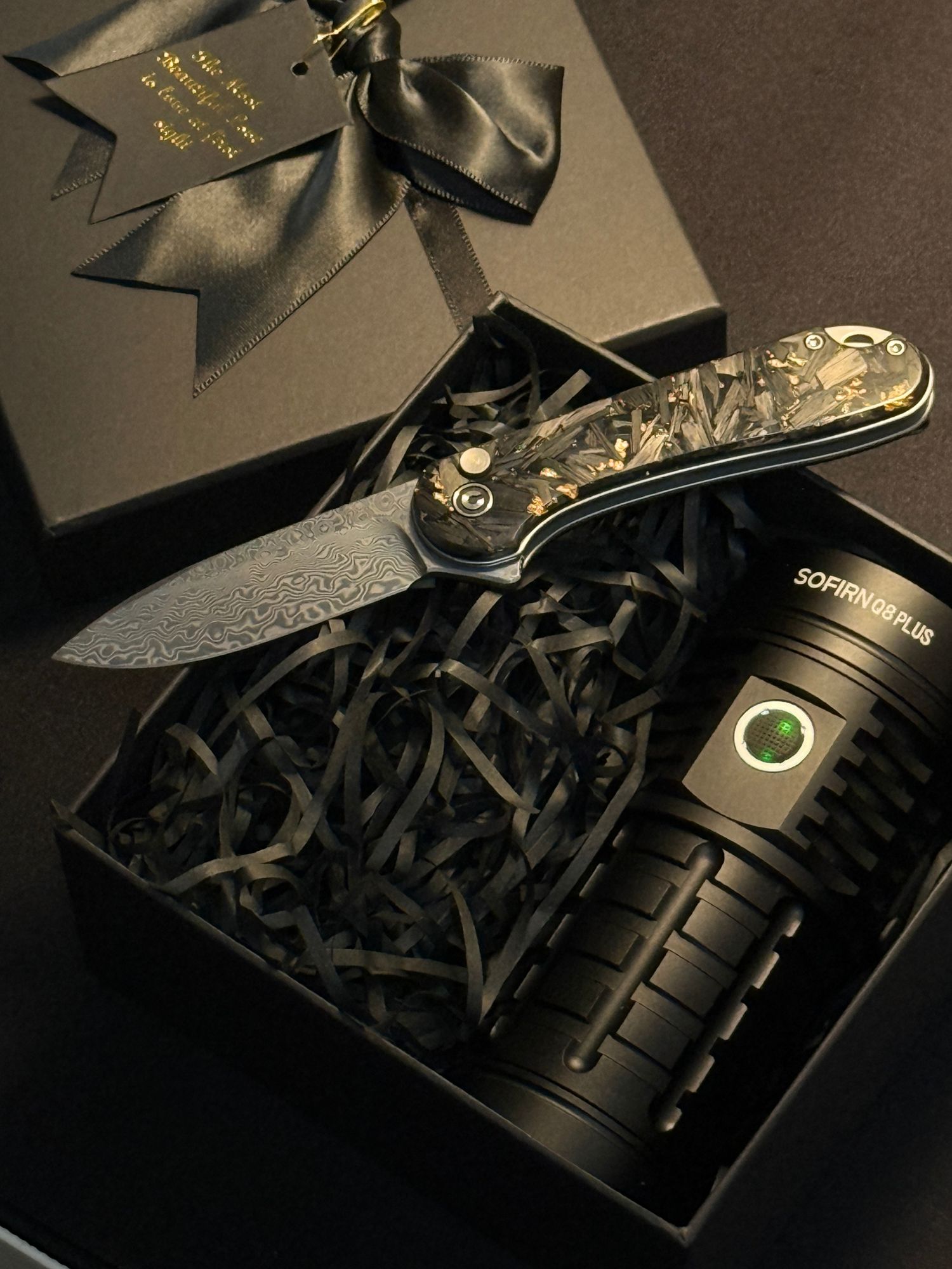 Дахин давтагдашгүй Дамаскус ган болон харанхуйг ялагч Q8 чийдэнгийн хослол. Энэ бол зүгээр нэг бэлэг биш, түүний хүч чадал, үнэ цэнийг илэрхийлэх дээд зэрэглэлийн сонголт юм.